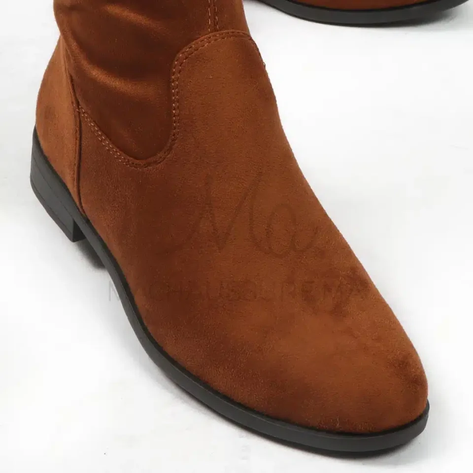 بوط نسائي من الجلد صناعي بكعب دائري مبطن من الداخل سهل الارتداء.